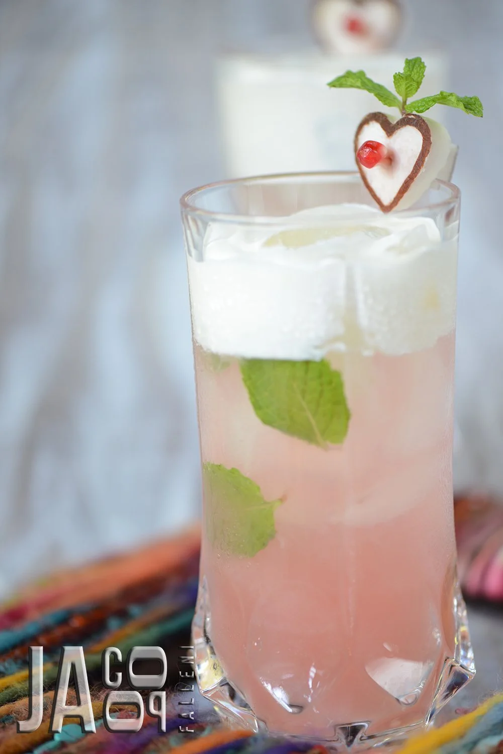 Now is time to serve it! I suggest straining and pouring on the rocks in a highball glass but you can also strain and pour into a nice chilled martini glass.. you choose! Last but not least, I carved a heart shaped garnish out the fresh coconut and added mint leaves and pomegranate seeds.